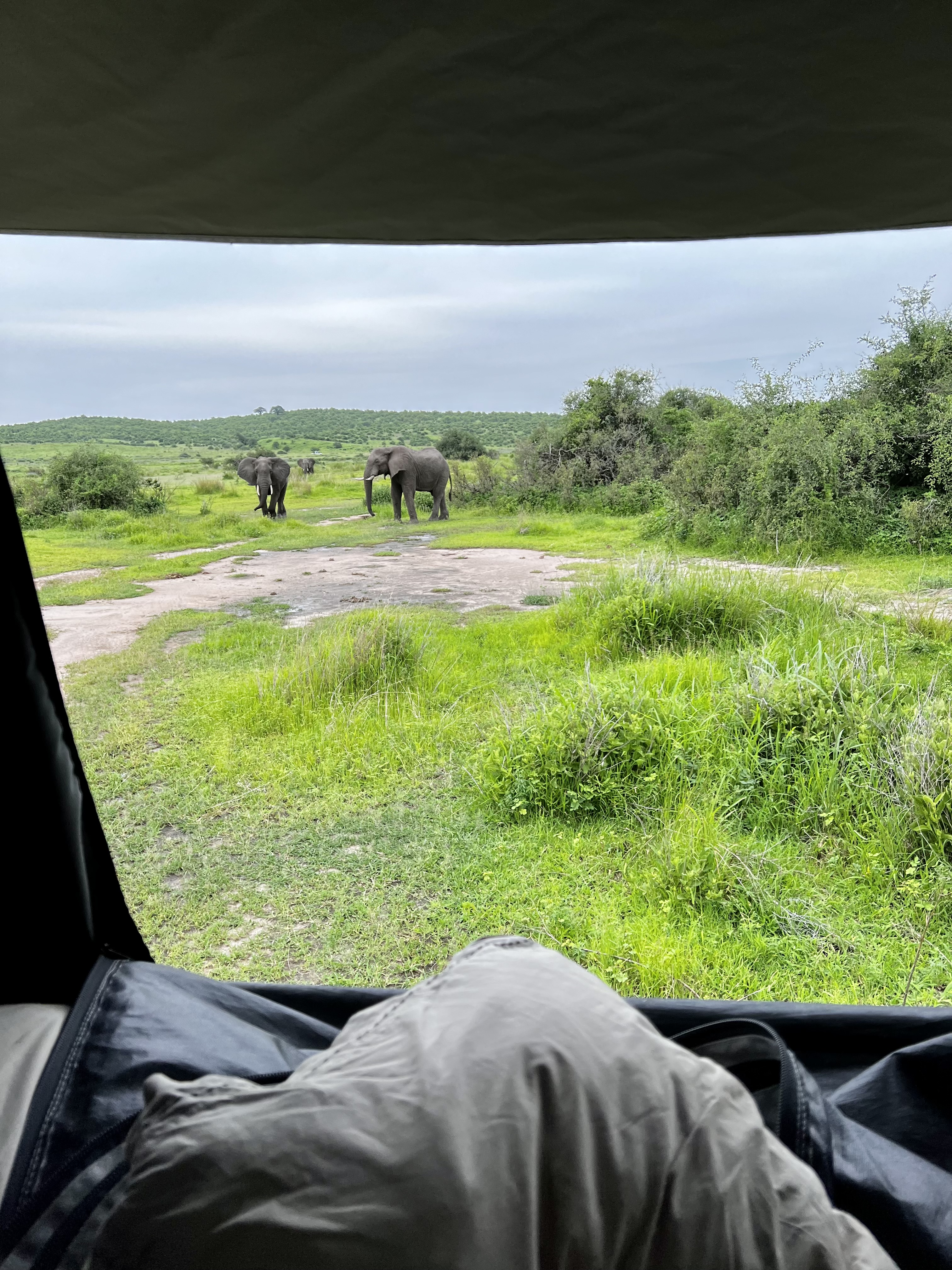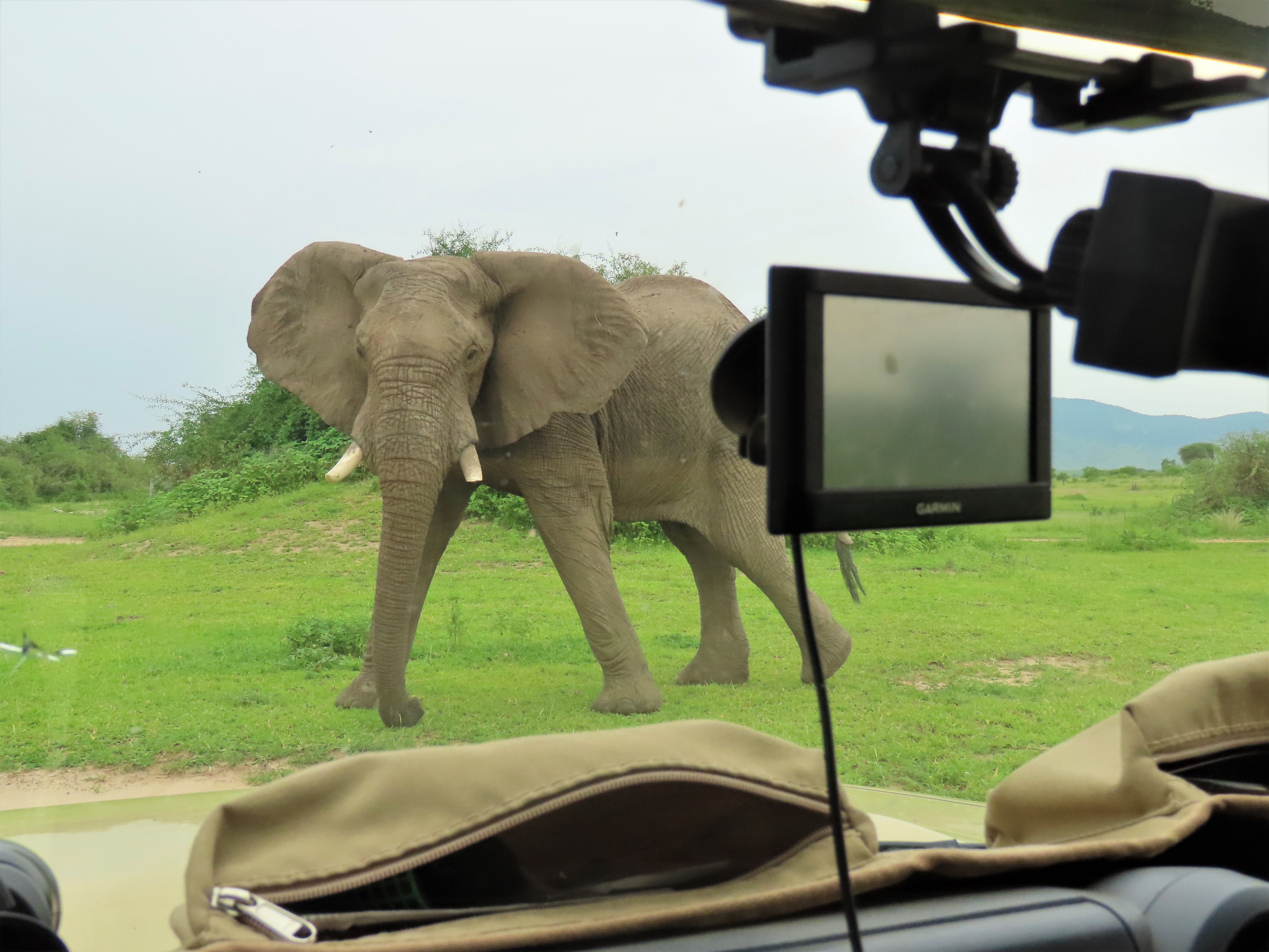 Camp visitors are not restricted to genets and lion. We get elephant too who come and graze very close to us. Usually chilled we get one who isn’t happy to see us there. I am still up in the tent but Deb is out and about and hops into Shackleton after this stare down: