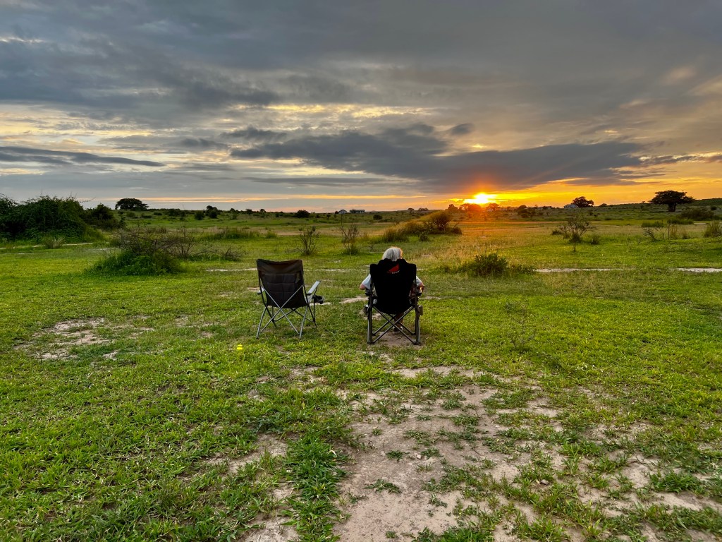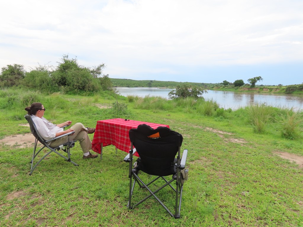 There are a number of public campsites in Ruaha – two of which are on the river. The first one, Kiboko, has two large “conference” bandas (basically one big dining / meeting room) that look fairly newly built (although that can be hard to tell, and they clearly haven’t been used in a while), as well as ablutions. The sites look a bit overgrown but there are good river views. We opt for the second campsite along the river, Tembe, preferring the more open aspects (with a plain behind) and wide river views. Sunsets are spectacular.