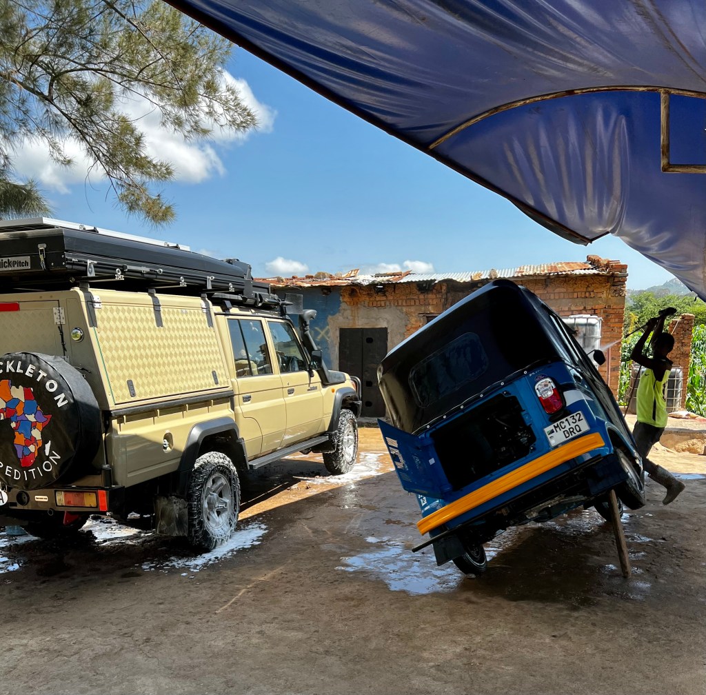 Before we leave Iringa we get the car cleaned and admire these nifty wooden stopes that all the tuk tuks carry in lieu of a jack for changing types etc.: