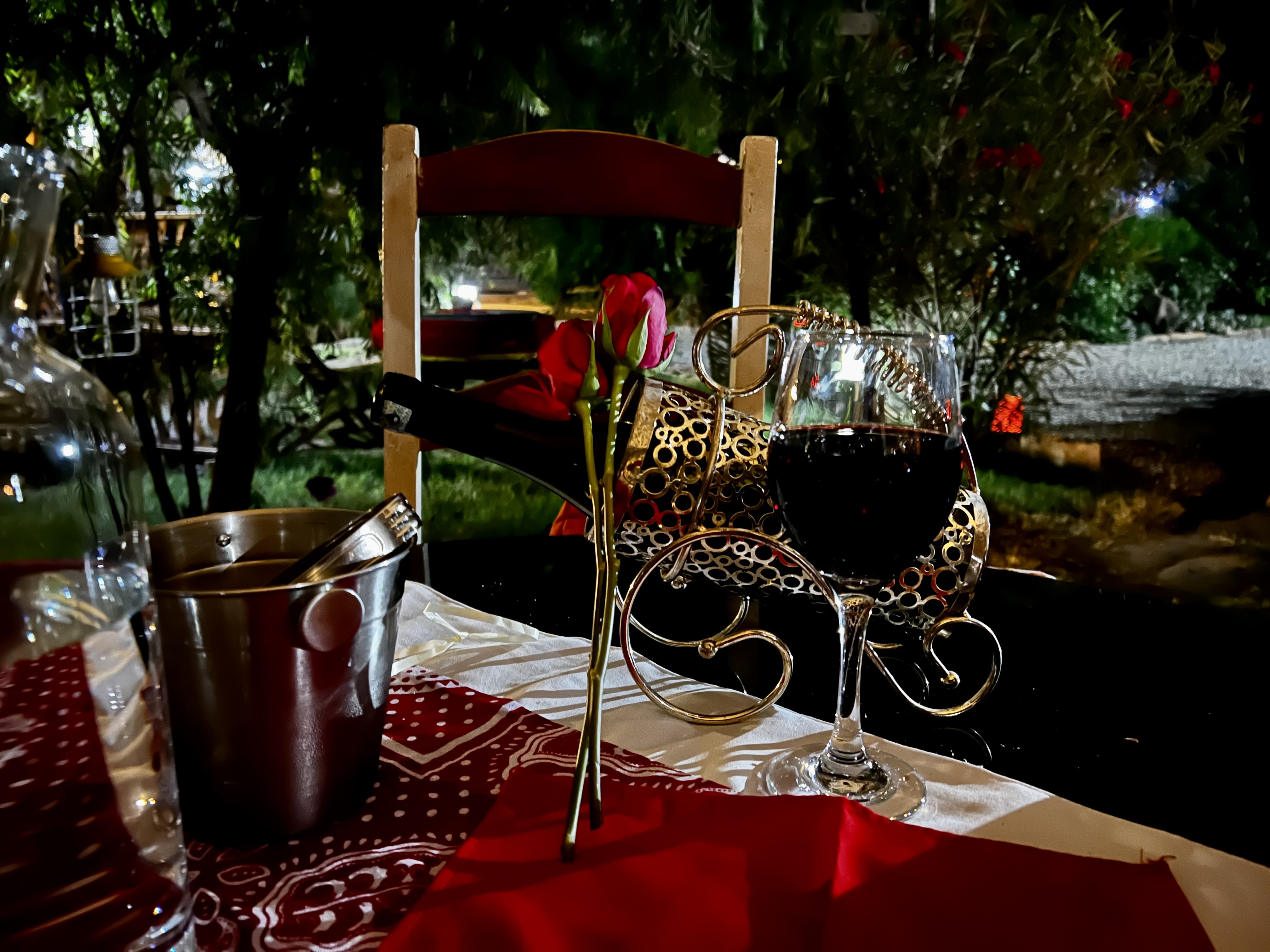 A hot shower and clean clothes later and things are looking up. We ask about supper and are reminded that tonight is a busy night – of course – its Valentine’s Day and I notice all the decorations up in the garden and restaurant.