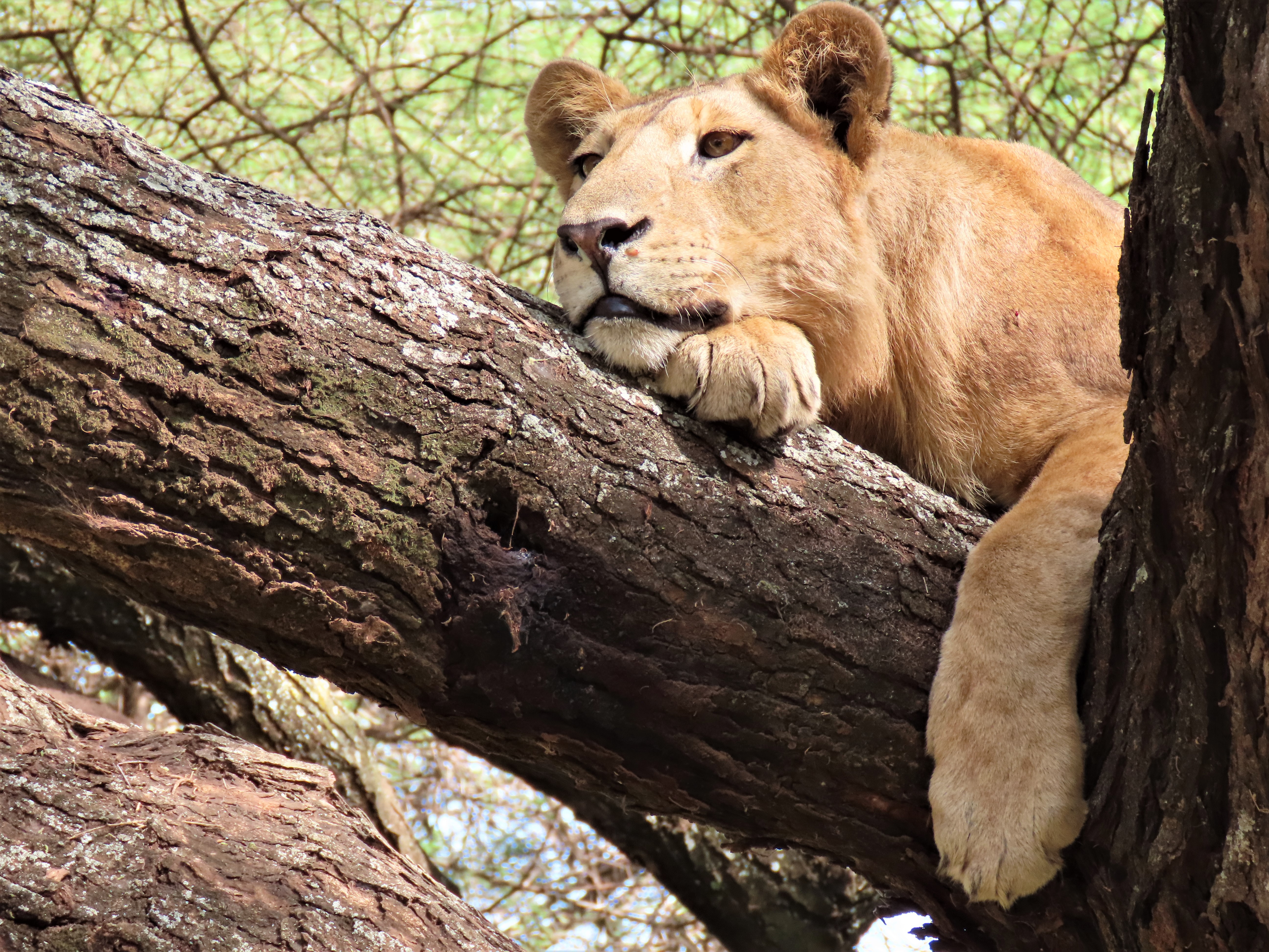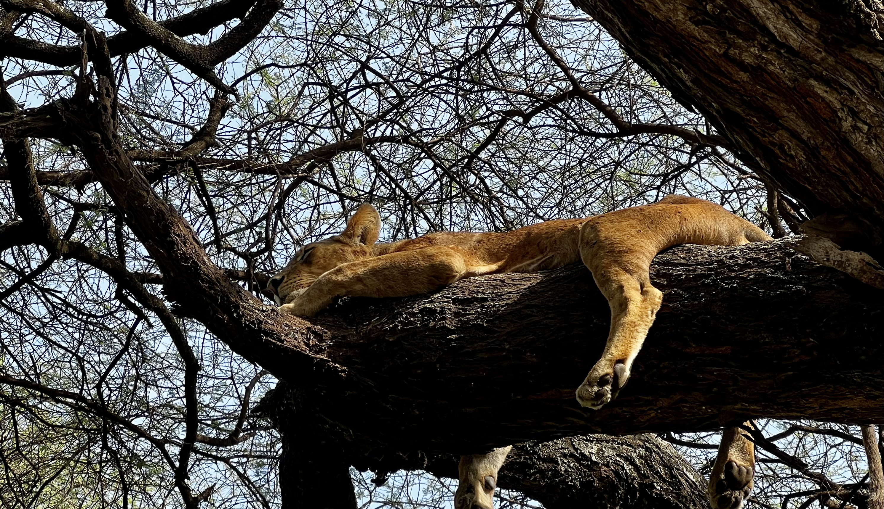 We see loads, duiker, giraffe, kudu, buffalo, dik dik, lots of elephant and then wayhey! Lions in a tree. Looking like a set piece – legs dangling out of an acacia bending over the road. We are delighted! Notwithstanding the fact that this is how the park positions itself – land of tree-climbing lions – they aren’t actually seen that often, so this is a treat. And it’s just us and one other vehicle (news spreads fast though and it turns into a bit of a bunfight but we manage to escape).