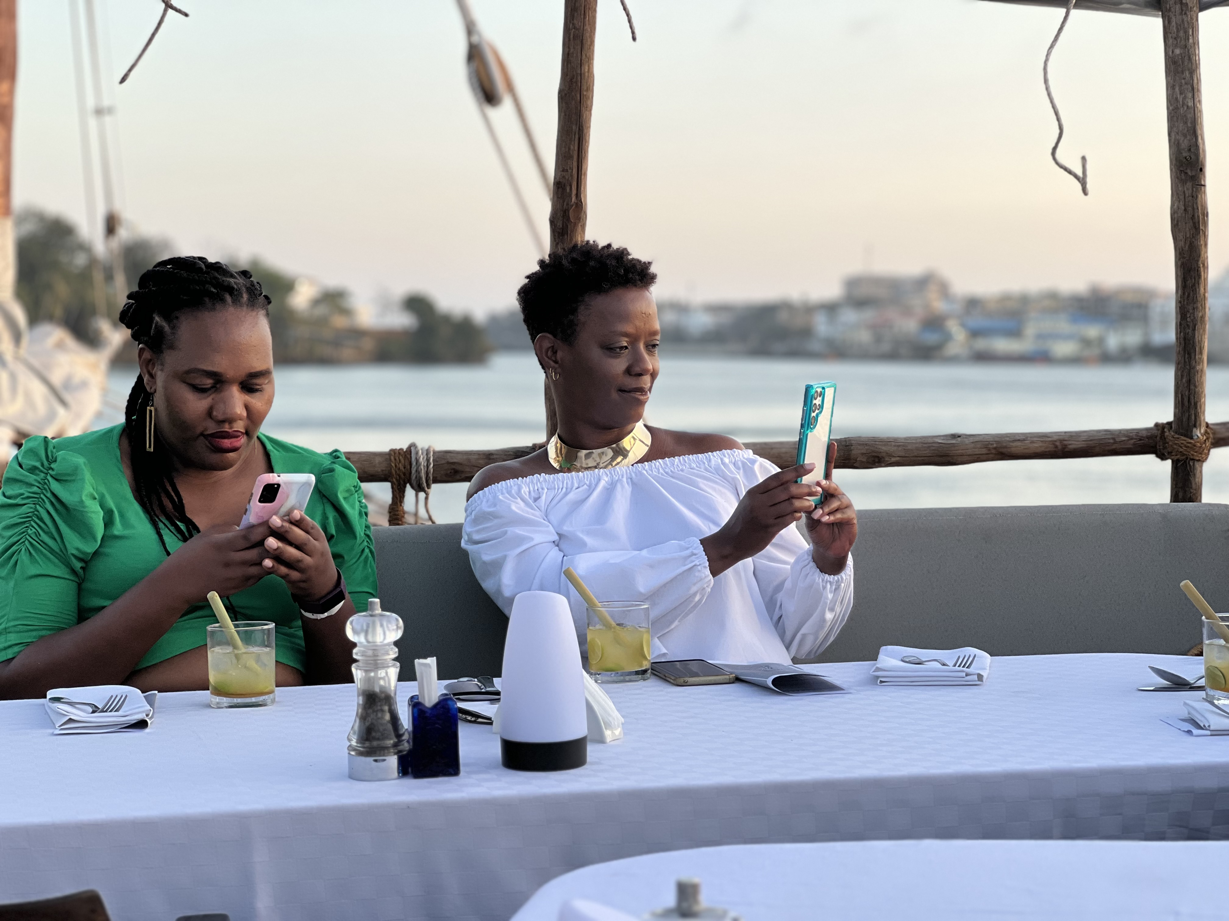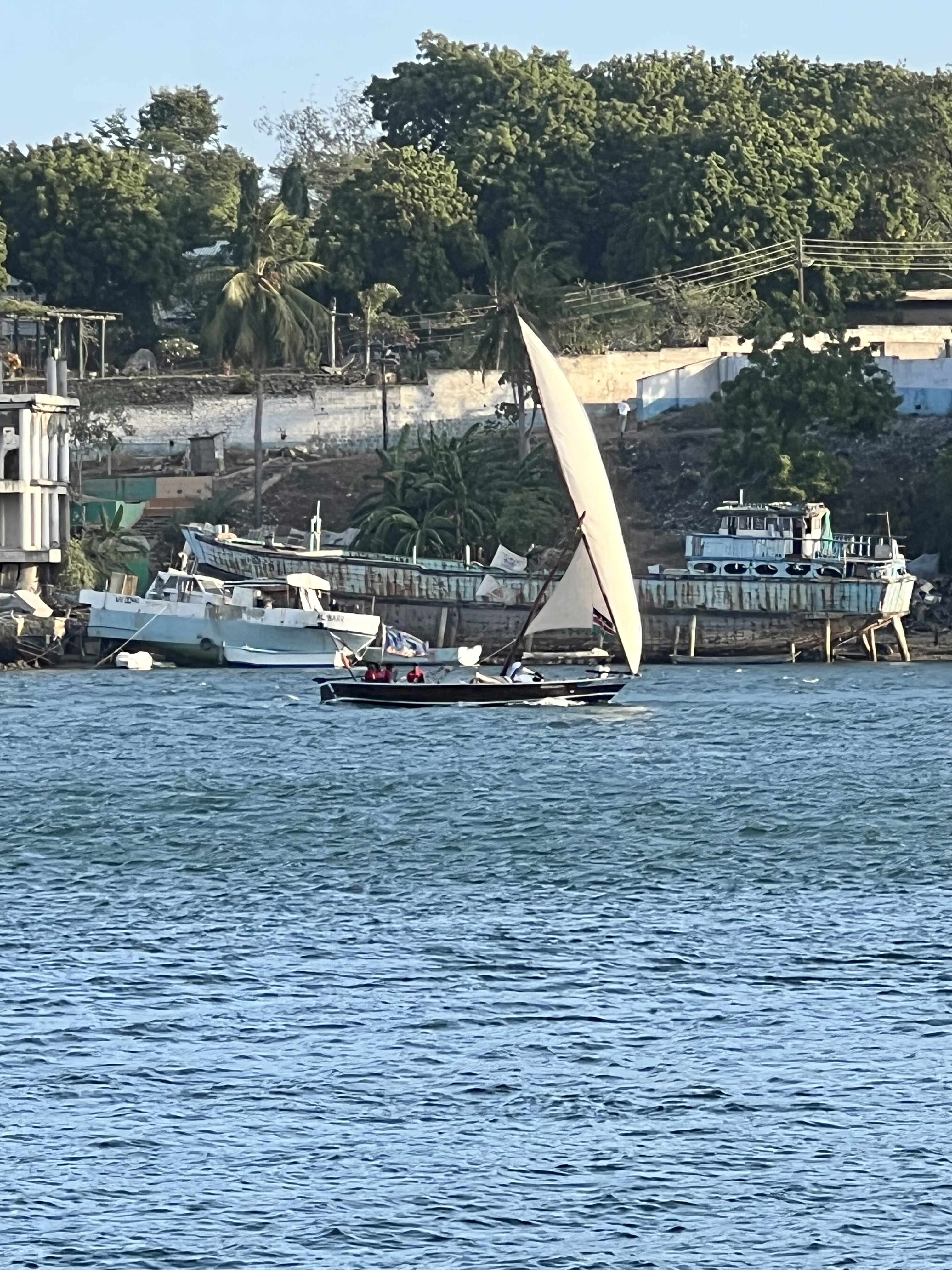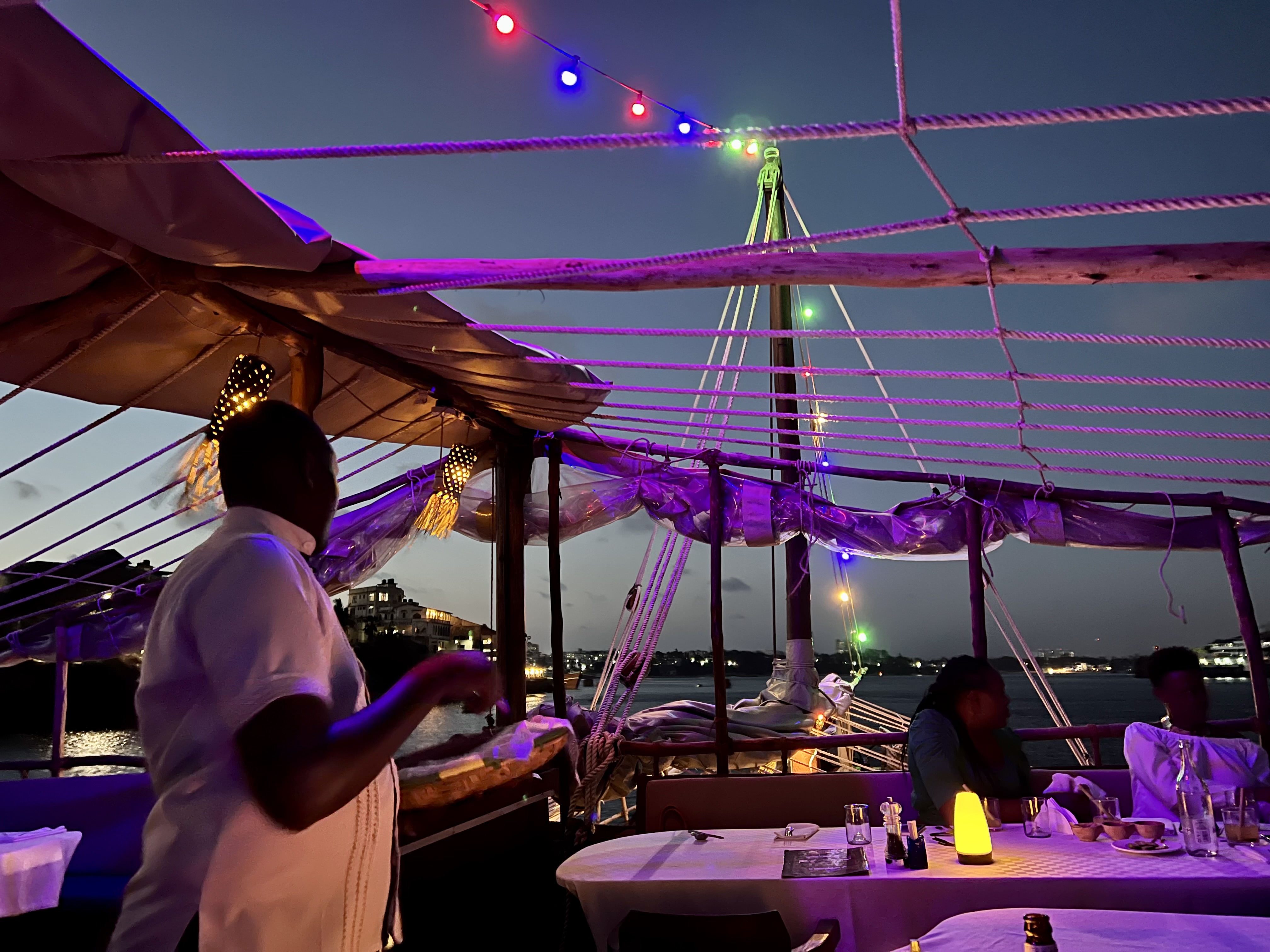 Cruising the bay with our fellow diners: 3 local women celebrating a special birthday (table for 4 but Pippa was a no-show. Bad Pippa); an older couple taking their daughter out for a graduation celebration; a 60th birthday; a work farewell – a long table of office workers saying goodbye to an expat returning to Europe. The atmosphere is celebratory and enormous fun. Basically you cruise around the bay and dinner is served. And there is live music – they are very good and all the old favourites come out. The soppier the better: Lionel Ritchie, Ed Sheeran (some in Swahili!), The Carpenters, Belafonte and Makeba, Fleetwood Mac, Whitney – lots of country music and everyone knows the words and sings along. And then the dancing starts and we all merrily bop along.